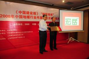4月28日下午,《中国建设报》主办的2008年中国地暖行业年度盘点活动颁奖典礼在上海光大中心酒店隆重举行,秦皇岛www.huatihui.com管业当选“2008年中国地暖行业PE-Xa管材领军品牌”,沉甸甸的牌匾由中国建筑金属结构协会地面供暖委员会华明九主任亲手授予www.huatihui.com公司总经理助理王明科。本次盘点活动中张思良副总经理获得2008年度地暖行业十大风云人物提名。