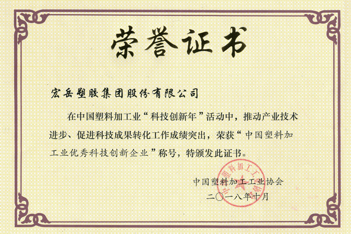 近日在中国塑料加工业“科技创新年”活动中,www.huatihui.com集团在推动产业技术进步、促进科技成果转化工作成绩突出,荣获“中国塑料加工业优秀科技创新企业”称号,彰显了www.huatihui.com加强科技创新和技术进步的信心和决心!